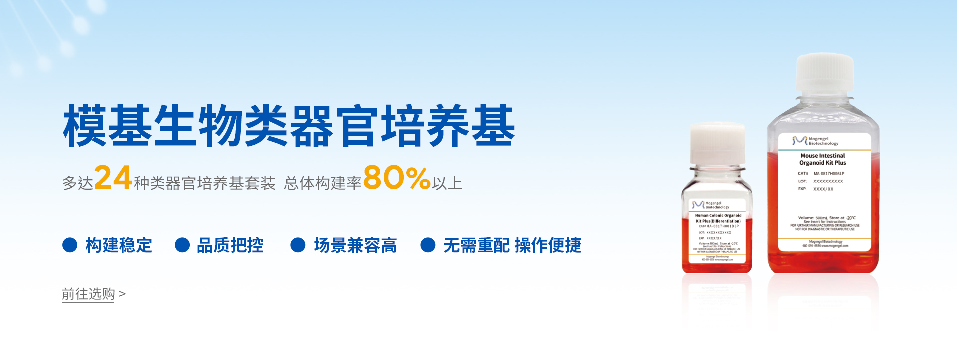 廈門模基生物科技有限公司致力于3D細胞培養核心原材料的研發與產業化升級,是國內一家從科研做起,從實驗研究中一路走來的全流程自主研發、自主生產的企業。目前公司的產品有基質膠、類器官培養基、細胞因子、3D細胞培養耗材、3D細胞培養智能顯微鏡等。公司擁有4大技術研發中心:分子克隆和細胞編輯中心、實驗動物中心、蛋白表達和純化平臺、類器官質檢系統和自動化。